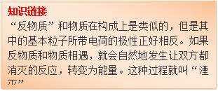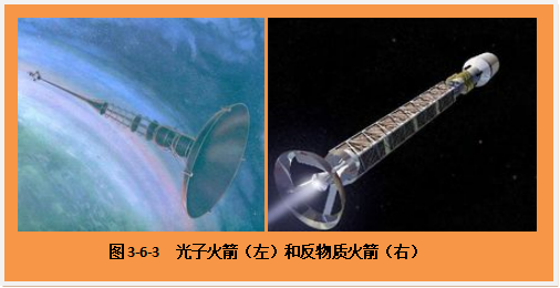 反物质火箭,也是利用正、反两种物质相遇便自然发生“湮灭”效应,这时它们的质量全部转化为能量——光能。利用这种“双消灭反应”所释放出的能量来加热液氢并使之从喷口射出,这样就产生了推力。由于反物质的湮灭产生的能量是氢氧化学反应的1百亿倍,所以反物质火箭只需要携带一点点燃料。科学家做过估算,只需要几到几十毫克的反物质就能帮助人类实现登上火星的梦想,而且只需要6周时间。尽管这种火箭所需的反物质很少,但是反物质在自然界中并不存在如何生产出反物质却是个大问题。据说,目前的大型强子对撞机需要花上1千年时间才能制造出1微克反物质!也许哪位小朋友将来能发明一种高效制造反物质的办法来?