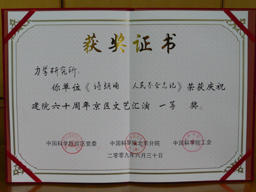 《人民不会忘记—献给郭永怀院士》在中科院京区院庆文艺汇演中获一等奖