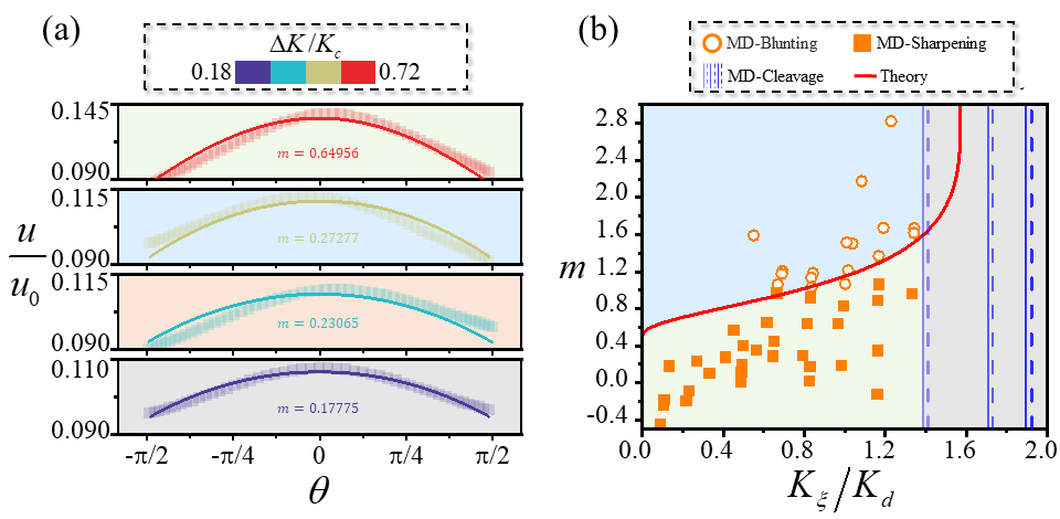 研究团队构建了“连续介质-原子嵌入”的多尺度力化耦合研究框架:远场区采用连续介质描述载荷响应,近裂尖区则保留原子结构进行分子动力学计算,从而在可控计算量下实现对溶解环境中裂尖演化过程的高分辨率解析。结果表明,溶解—应力耦合强度的变化不仅导致裂纹生长速率的非单调响应,还会使演化路径出现“分叉”。在弱耦合条件下,溶解倾向于发生在裂纹面台阶处的原子位置,促进裂尖钝化和稳定生长;而在强耦合条件下,则可激活裂尖处的无序原子,并使溶解优先发生在裂尖处,形成“优先溶解—应力重分布—锐化增强”的反馈过程,进而更易触发失稳扩展。基于此,团队提出了表征溶解-应力耦合强度的普适性指标,其能够准确刻画裂纹尖端的关键响应(钝化、锐化和解理)及扩展趋势。将该指标应用于“腐蚀坑向裂纹转变”这一典型工程案例,推导出腐蚀坑尺寸与应力幅之间的定量标度律,结果与实验数据吻合良好。