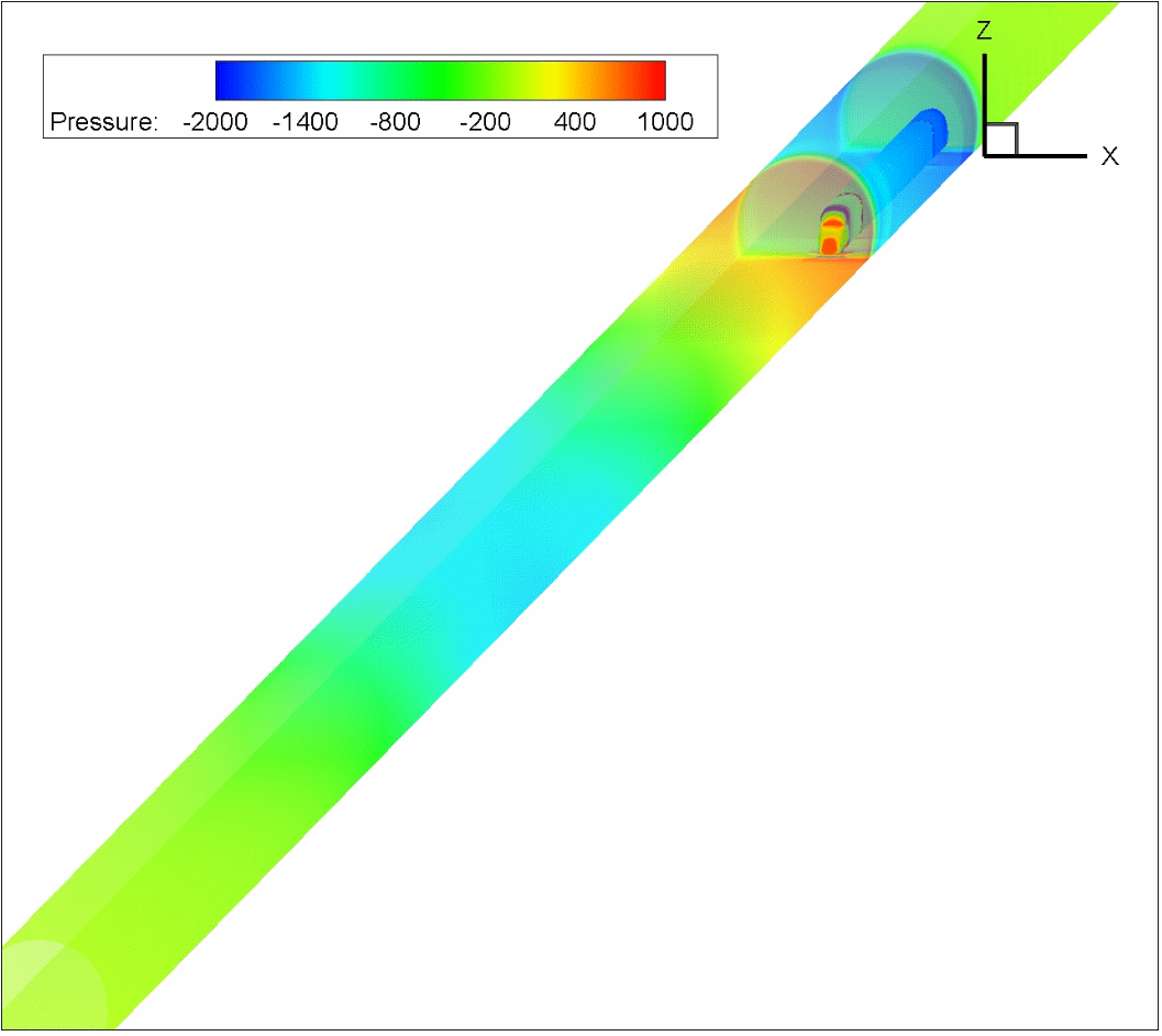 高速列车在隧道内运行是最为复杂和恶劣的运行工况,在隧道内运行时列车的表面压力幅值要远远大于列车在明线运行时的表面压力。列车进入隧道时,列车前方的空气受到挤压来不及从隧道口排除,压力急剧升高,在入口处产生一个压缩波,向隧道出口以音速传播;当列车的车尾进入隧道时,列车后方由于隧道内空气来不及补充,压力急剧降低,形成一个膨胀波,这一膨胀波将掠过车体以音速向隧道出口传播。在隧道出口压缩波和膨胀波一部分会以微气压波的形式向外散射,另一部分发生相互转化后反射回来向隧道入口传播。如果隧道比较长,隧道内压力波会反复作用于列车,使得列车表面压力在短时间内发生剧烈变化,这种剧烈的压力变化考验着列车的气密性,如果列车气密性较差,车外的压力波动会传入车内,引起车内压力发生突变,造成乘客耳鸣,影响乘坐舒适性。同时,受隧道压力波的影响,列车在隧道内所受的气动力会发生不平衡的现象:我国在高铁运营期间,发现在具有多个隧道的线路上运行时,列车轮、轨之间的磨损比完全明线运行条件下要严重得多;日本还发现列车在隧道中运行时尾车出现横向摆动现象。一般地,减小列车最大横截面积与隧道横截面积的比值(阻塞比),可以有效地减弱隧道压力波的强度,这也是高速列车一直在追求“苗条”和“瘦身”的原因之一。