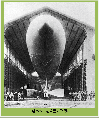 1884年,法国的路纳德和克里布又制造了一艘“法兰西号”飞艇,采用蓄电池供电的电动机做动力,在89日解缆试航。法兰西号起飞后,在离开出发点约4千米处返航,其间还更改过航向。在降落中也多次前后转动,以对准着陆点。整个试飞历时25分钟,飞行速度最高达每小时24千米。这是人类第一艘能操纵的飞艇。