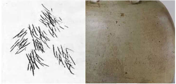 裂纹有大有小,有长有短,有粗有细,有曲有直,且形状各异,有的像鱼子,有的像柳叶,有的像蟹爪。老大欲哭无泪,痛定思痛之后,他重新振作精神,他泡了一杯茶,把浓浓的茶水涂在瓷器上,裂纹马上变成茶色线条,他又把墨汁涂上去,裂纹立即变成黑色线条,这样,不经意中形成“金丝铁线”。