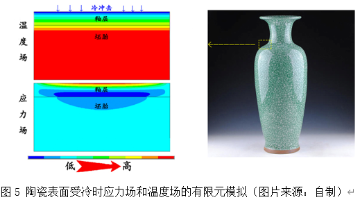 上文中提到章生二打开窑门使冷空气进入,造成其兄满窑瓷器釉面都开裂了,这是因为:当冷空气进入窑内,瓷器表面的釉面受冷,由于热胀冷缩,釉面快速收缩,但是此时内部坯体的温度下降的很少,这样釉面就会受到坯体阻止釉面收缩的拉力(如图5)。当釉层表面产生拉应力超过釉层的强度,釉面就会开裂。