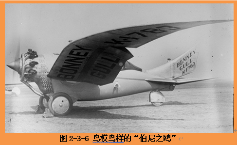 甚至到了20世纪20年代末期,依然有人执意要模仿鸟类来提高飞机的飞行性能,美国人伦纳德·伯尼就是这样一位执着者。他在1925年打造了一只十足的“金属鸟”:圆润的机身采用铝制波纹蒙皮,并列双座驾驶舱呈气泡形,机翼和机尾更是鸟儿的翻版,只是他不像前人那样使用可以拍打的扑翼而是固定翼。他还把这架飞机命名为“伯尼之鸥”。然而,这架“鸟模鸟样”的飞机在1928年进行试飞时,只爬高10左右就摇晃起来,随后一头撞向地面,伯尼也被从座舱里甩了出来,并不治身亡。怪不得有人把这架飞机叫做“笨鸟”,因为英文“Gull 既有“鸥”的意思也有“愚笨”的意思。