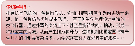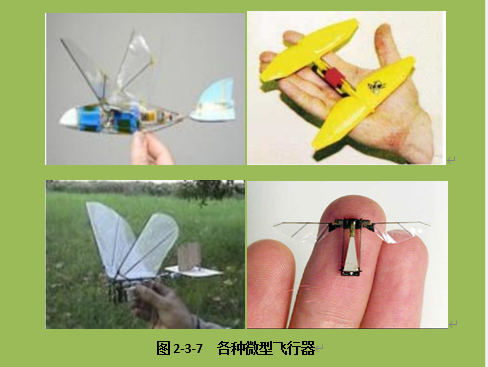 然而,仿生设计一直是科学家和工程师的不懈追求,因为自然界的飞行生物(鸟类和昆虫)无一例外地都是采用扑翼飞行方式。它们的主要特点是将举升、悬停和推进等多种功能集于一个扑翼系统,可以用很小的能量进行长距离飞行,同时具有较强的机动性。在新世纪到来之际,扑翼机的研究又取得了不少的进步。例如,扑翼在微型飞行器中得到了较广泛的应用,它们翼展尺寸在15厘米以下,不能用于载人飞行,但在民用领域可以进行生化探测与环境监测,在国防领域可用于战场侦察、巡逻突袭、信号干扰等。