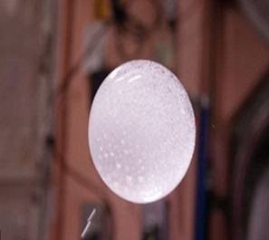 假如你身处太空环境中,还可以看到更多的地球上见不到的情景。例如,你不小心碰倒一杯水,不用担心水会亲吻你的脚,因为它会趋于球形悬浮在空中(如图2所示)。2013620日,神舟十号女航天员王亚平在天宫一号开展了水膜和水球制作实验(参见图3),演示了液体表面张力的作用。首先,她将一个金属圈插入装满水的饮水袋中,抽出后可以看到:在金属圈上便形成了一个水膜。为了验证这个水膜是否结实,她轻晃金属圈,水膜并不破裂,只是甩出了一个小水滴。当她继续将一个画有中国结图案的塑料片贴在水膜表面时,水膜也依然完好。当在水膜上继续注水时,水膜甚至会长成一个晶莹剔透的大水球。这些魔法般的现象是如何发生的呢?原来在地面常重力下,由于重力作用很强,分子与分子之间微小的引力或斥力(称为表面张力)可以忽略不计,水膜会在重力作用下四分五裂而难以维持;但在太空微重力环境下,重力作用很弱,这时微小的表面张力便充分显示它的能力,即有使物体表面收缩到最小面积的倾向[2]。所以,此微重力下的水滴形状都是趋向于球形。