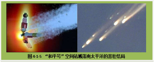 尽管“和平号”成就辉煌,但也经不起岁月磨难。2001323日,是“和平号”寿终正寝的日子。与“和平号”对接的“进步M1-5”货运飞船的发动机点火以后,在发动机的反推制动下,“和平号”的飞行速度陡然下降并快速向下飘落,在进入大气层后开始损坏,最后燃烧殆尽的残骸落入了南太平洋冰冷的海水中。坠落,所以选择这种销毁的方式,是由于空间站结构太复杂,体积也太大,如果滞留在太空,将会成为一堆威胁性很大的太空垃圾。