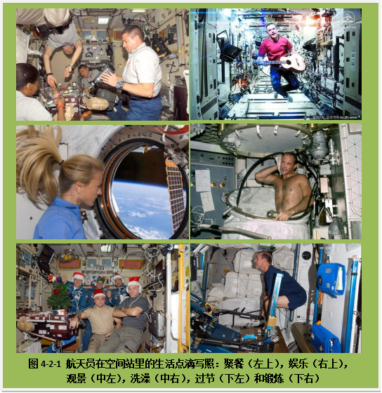 由于航天员往往要在空间站里长时间的值班守候,所以空间站要有人类能够“舒适”生活的一切设施。2017年,美国宇航员佩吉·维特森国际空间站”里呆535天,刷新了太空生活累计时间的记录。这么长时间处于失重状态还要完成许多工作,可不是件容易的事儿啊!