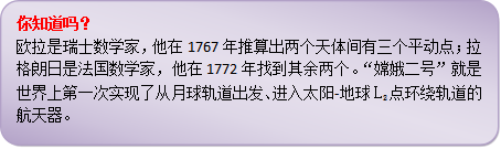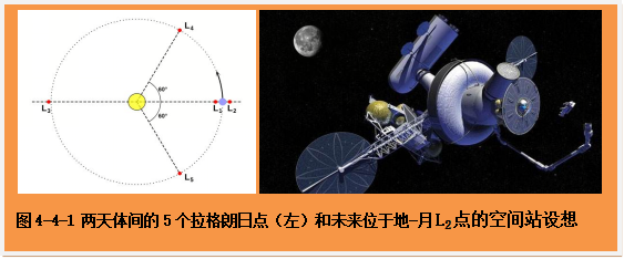 哈哈,小朋友马上要问:什么是拉格朗日点啊?其实,它的学名叫“平动点”,是十八世纪的数学家欧拉和拉格朗日推算出来的。两位数学家证明了:在两个大天体(例如,地球和月球,太阳和地球)的引力作用下,在空间中一定有5个特别的位置点;在这些点上(L1—L5),一个质量可以忽略的小物体(如人造卫星、空间站)相对于这两个大天体基本保持静止。如果把空间站设置在地-月体系的L2点,到月球的距离只有6.5万千米左右,更便于控制月球背面月球车的运行和航天员月面取样返回,在此处放置射电望远镜时可以避免来自地球的电磁波干扰,可以更方便探测近地小行星、火星及其卫星,而且可以为宇航员和航天工程师积累深空操作的经验