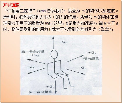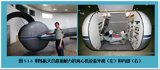 而超重现象是航天员无法回避的情况,因为航天器在发射和回地的期间要迅速地增加或减少它的飞行速度,这种很高的加速度或减速度便使得航天员受到的附加力比他自身重力要大,感到自己身体的重量有所增加,心脏、横膈、胃肠等内脏器官发生移位或变形,血液重量也有所增加并会在体内重新分配。航天员受到的超重会发生在不同的方向上。如果是胸—背向的超重,仿佛有一双手在自己的胸部使劲地向下摁,会使航天员的呼吸功能、心血管功能发生异常,甚至因头部供血不足而发生视觉障碍或意识丧失;如果是头—(骨)盆向的超重,仿佛有一双手在自己的肩上使劲地向下摁,两只腿如同灌了铅似的沉重,并会对航天员的识别、判断和操作能力发生影响。幸运的是,在正常的载人航天飞行中,超重的作用时间是短暂的,目前主要是通过在离心机里产生的人造超重环境进行超重耐力训练的办法,使航天员能适应在升空和回地两个时段的超重环境。